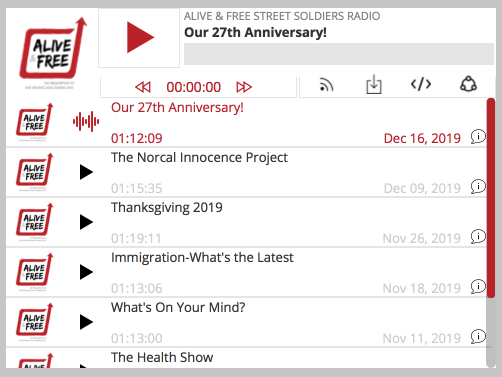 Street Soldiers Radio introduces you to the city of East Palo Alto and the birth of Live in Peace with Heather Starnes-Logwood and Eugene Jackson. They empower their youth to reclaim the vision for their future. http://traffic.libsyn.com/aliveandfree/streetsoldiers_radio_liveinpeace_eastpaloalto_oct_6_2019.mp3Podcast: Play in new window | DownloadSubscribe: RSS