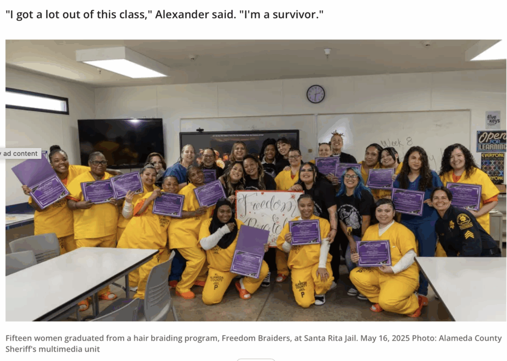 “I’ve always wanted to learn how to braid,” she said. “But it’s more than just learning how to braid. It’s learning to heal from trauma.” https://www.ktvu.com/news/santa-rita-jail-women-graduate-from-hair-braiding-program-freedom-braiders